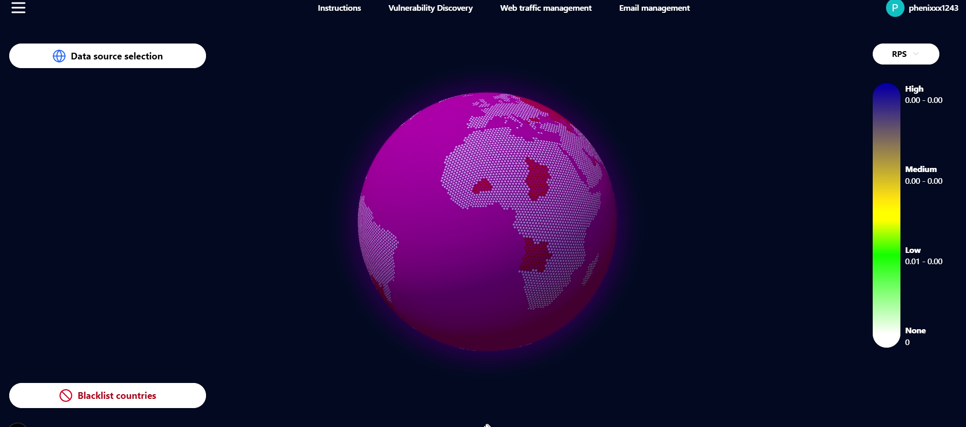 Интерактивный 3D‑глобус показывает трафик по числу запросов, пользователям и объёму с историей изменений.