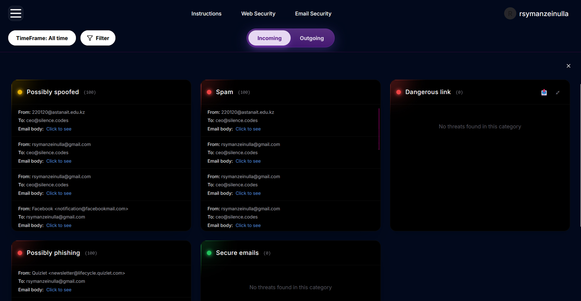 - Пятислойная защита с ИИ и автоматической категоризацией писем (Безопасно, Спам, Опасные ссылки, Фишинг, Спуфинг)